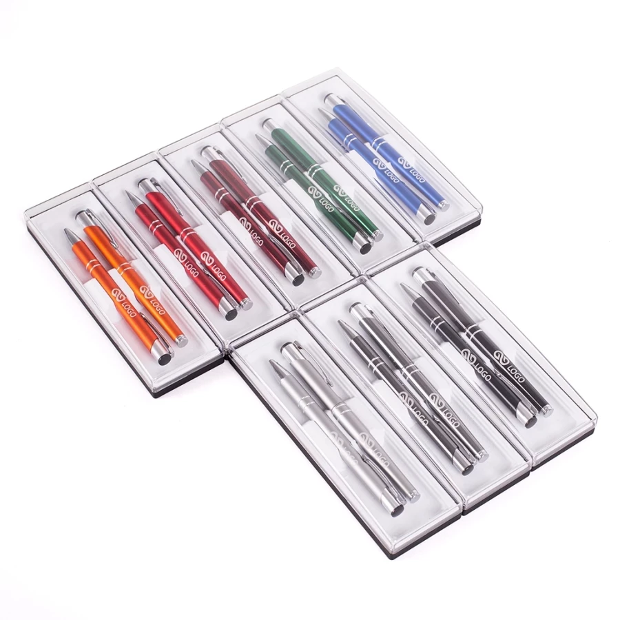 OCosmo 2-Piece Pen+Pen é um conjunto de caneta e caneta embalado num estojo elegante. Estão disponíveis em duas cores, embalados em conjuntos de 20 unidades. Os corpos de cada uma podem ser gravados com uma inscrição ou um gráfico - por exemplo, o logótipo da sua empresa. A esferográfica é accionada por botão de pressão e inclui uma recarga Elite azul substituível. A caneta tem uma tampa com um clip cromado. Este conjunto pode ser utilizado como um complemento interessante para um conjunto de gadgets distribuídos em feiras de empresas.